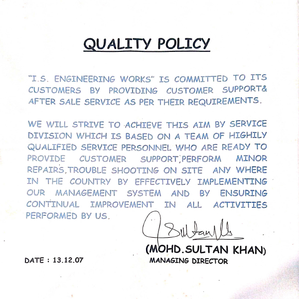 "Is Engineering Works " is committed to its customer by providing customer support and after sale services as per their requirements.